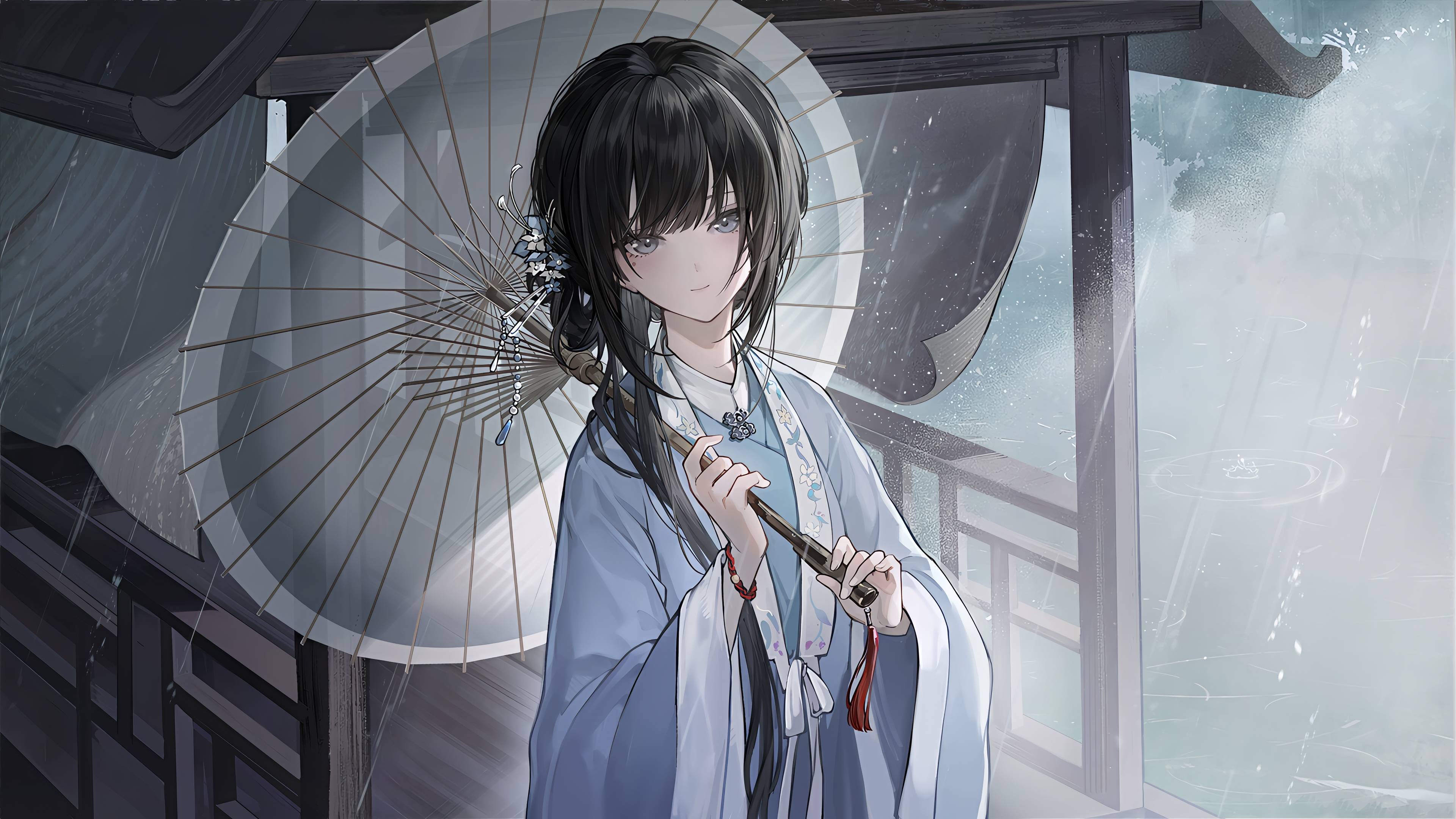 雨水浸湿了她衣服的边缘,却没有在她瀑布般的黑发上留下一丝痕迹。